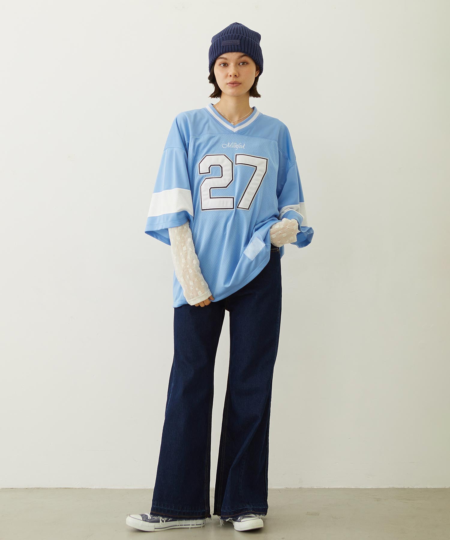 アメリカンフットボールのユニフォームデザインを落とし込んだビックシルエットのシャツ。