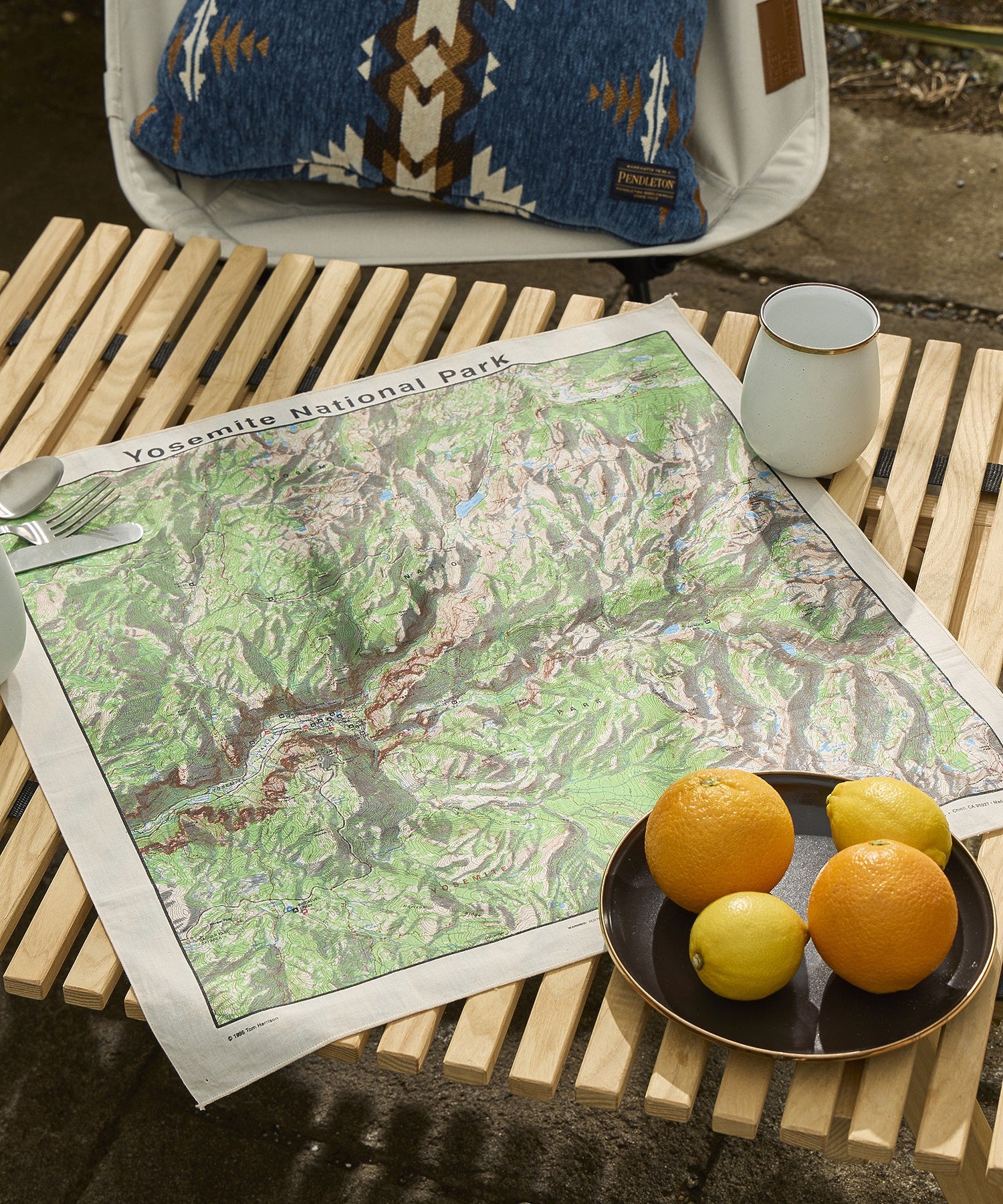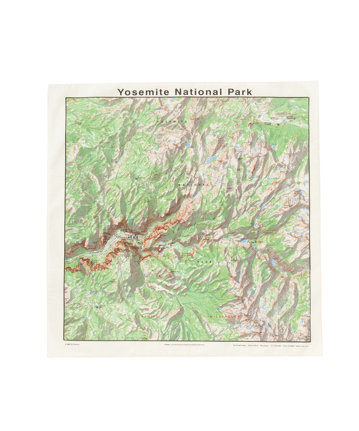 アメリカが誇る雄大な自然、ヨセミテ国立公園の地形図を大胆にデザインしたコットン100%のバンダナです。