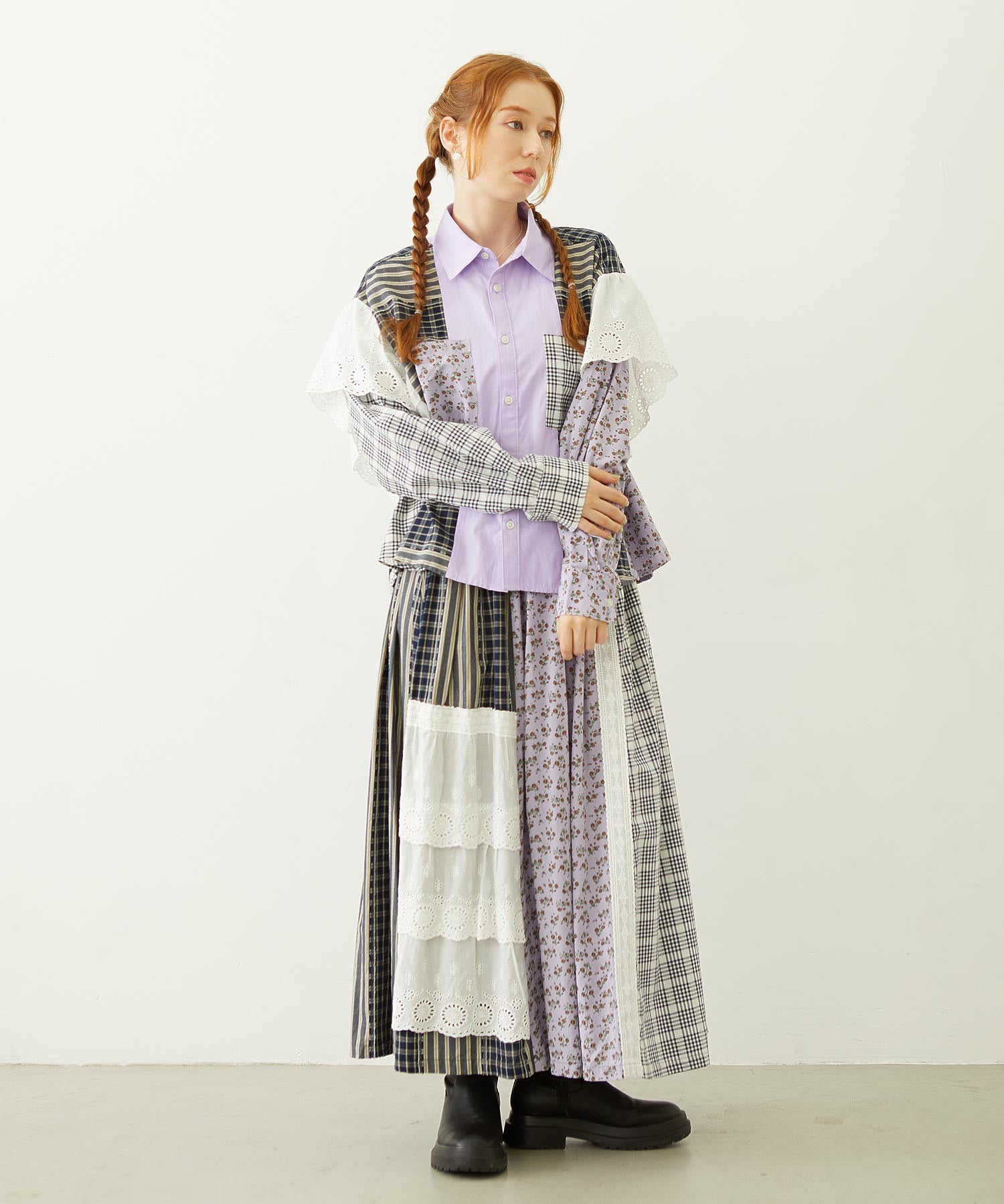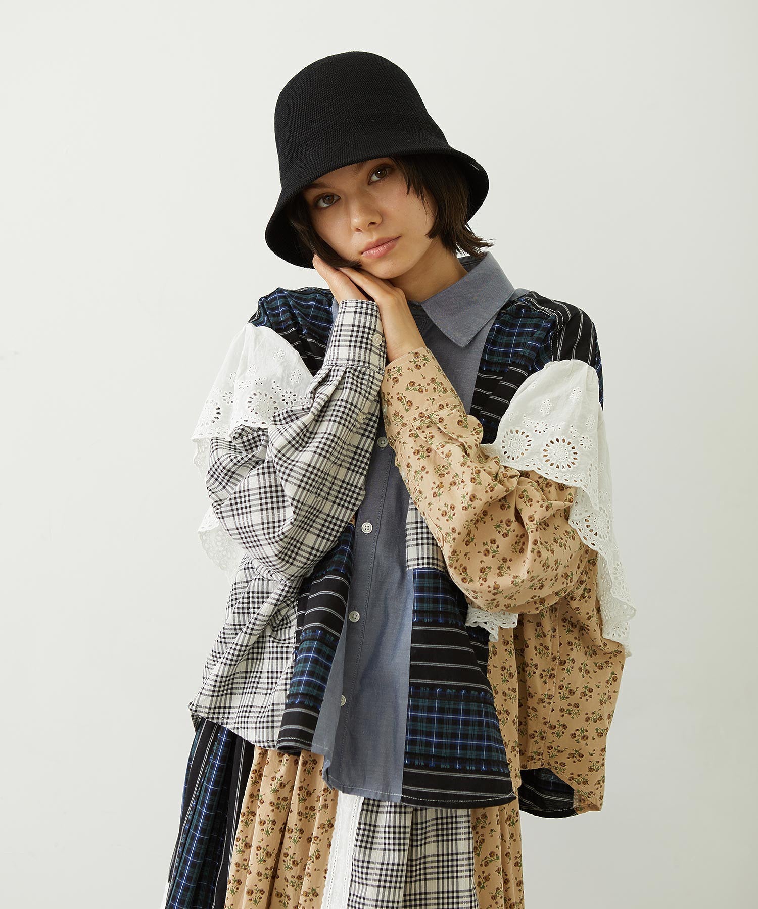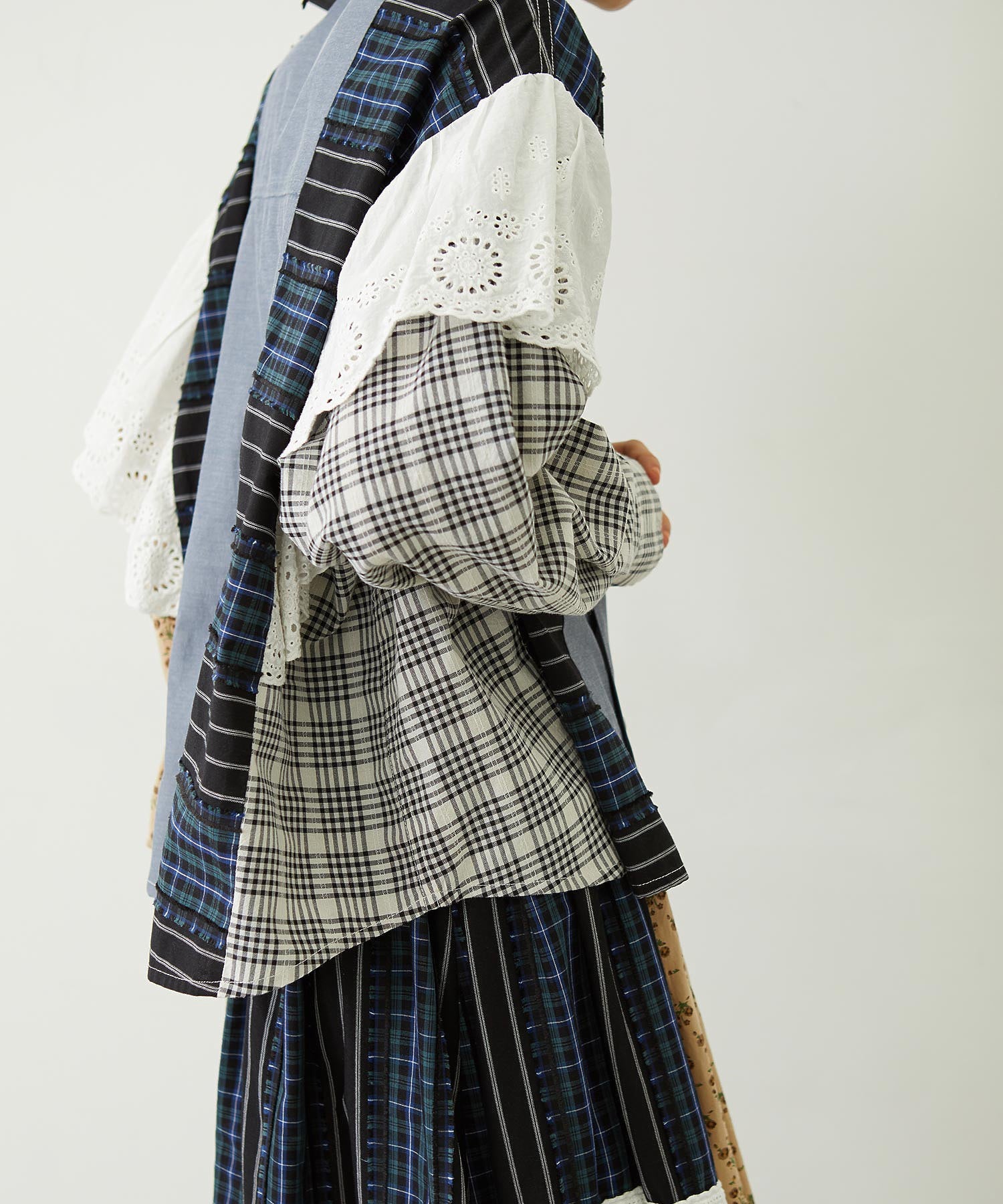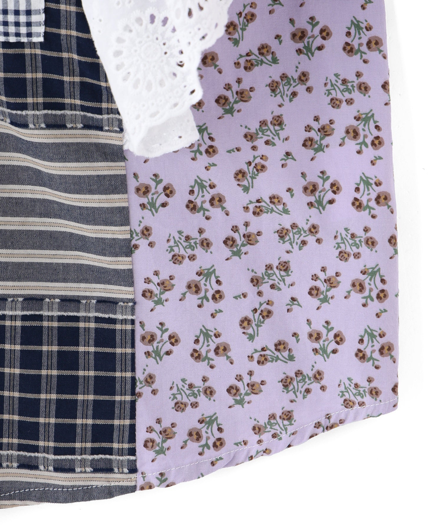素材 無地部分:ポリエステル56% 綿44% チェックA:綿100% チェックB:綿63% ポリエステル37% 花柄部分:綿77% レーヨン19% 麻4% レース部分:綿100%