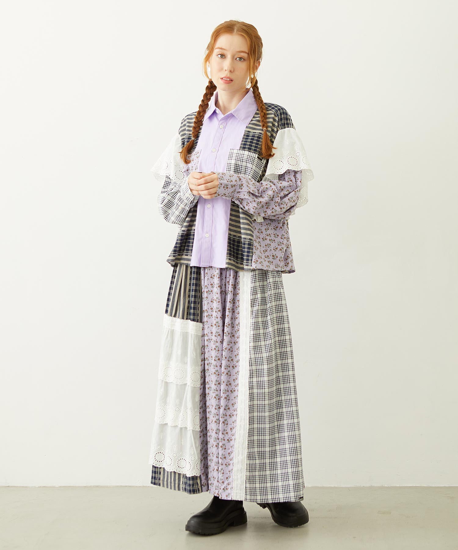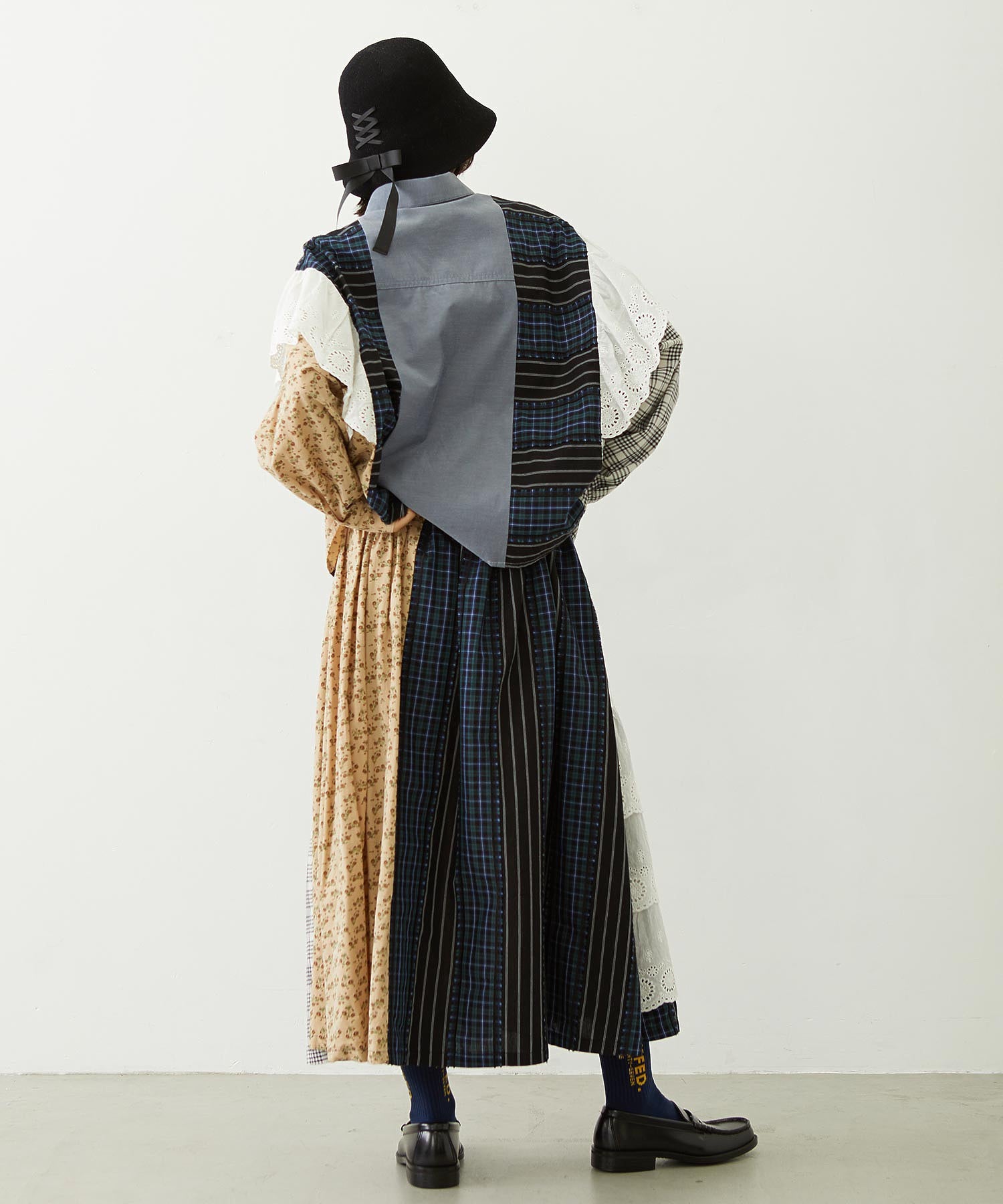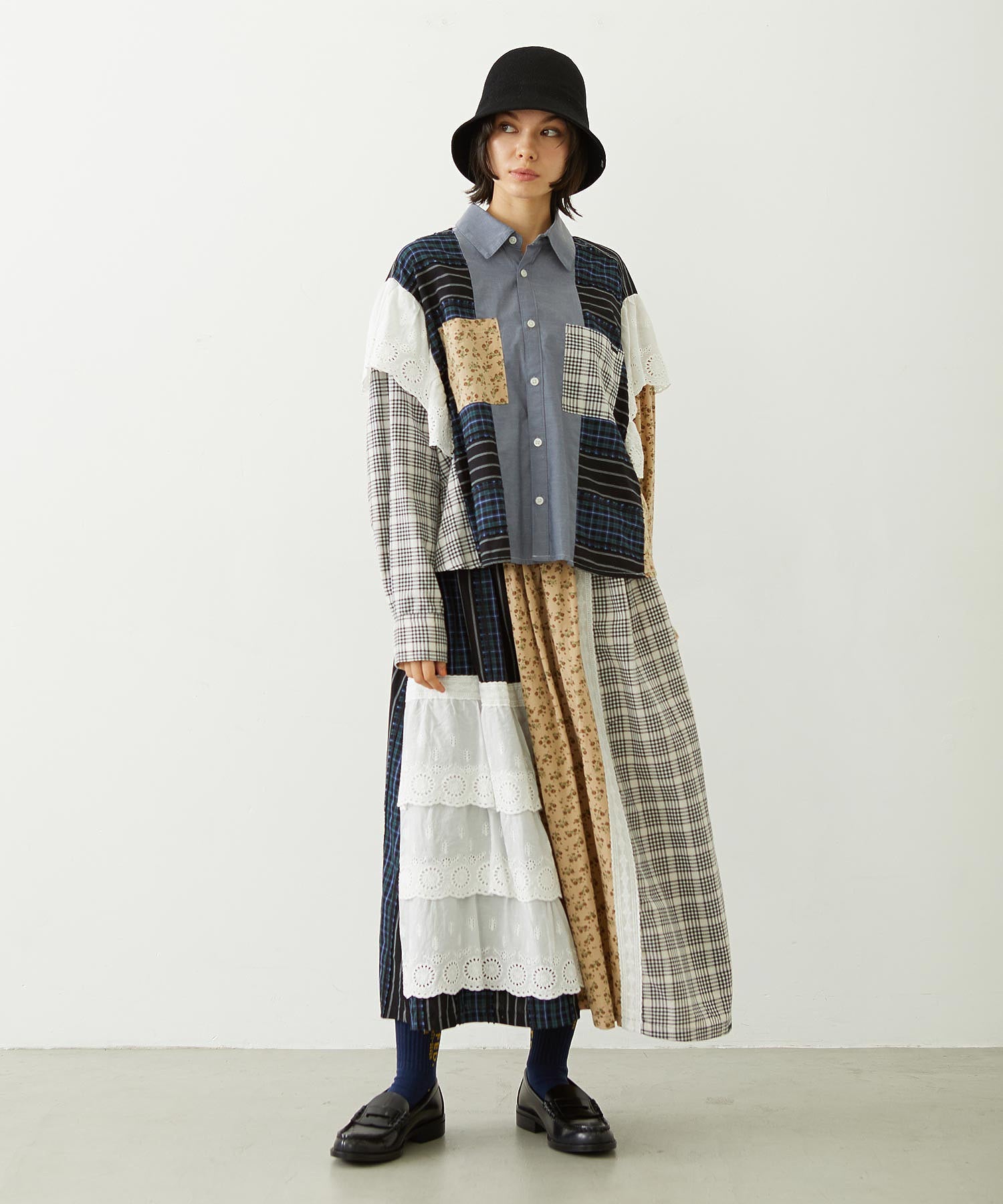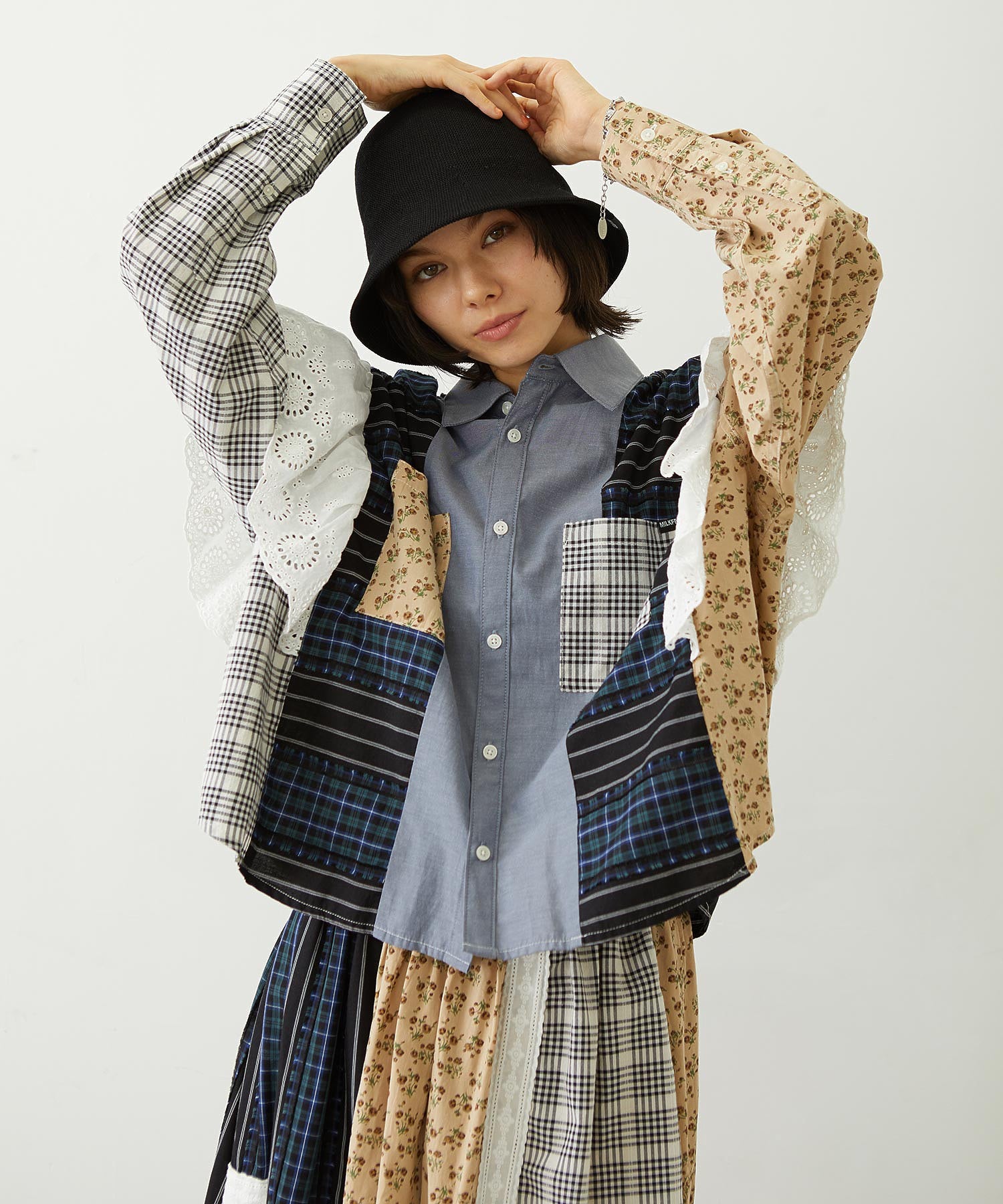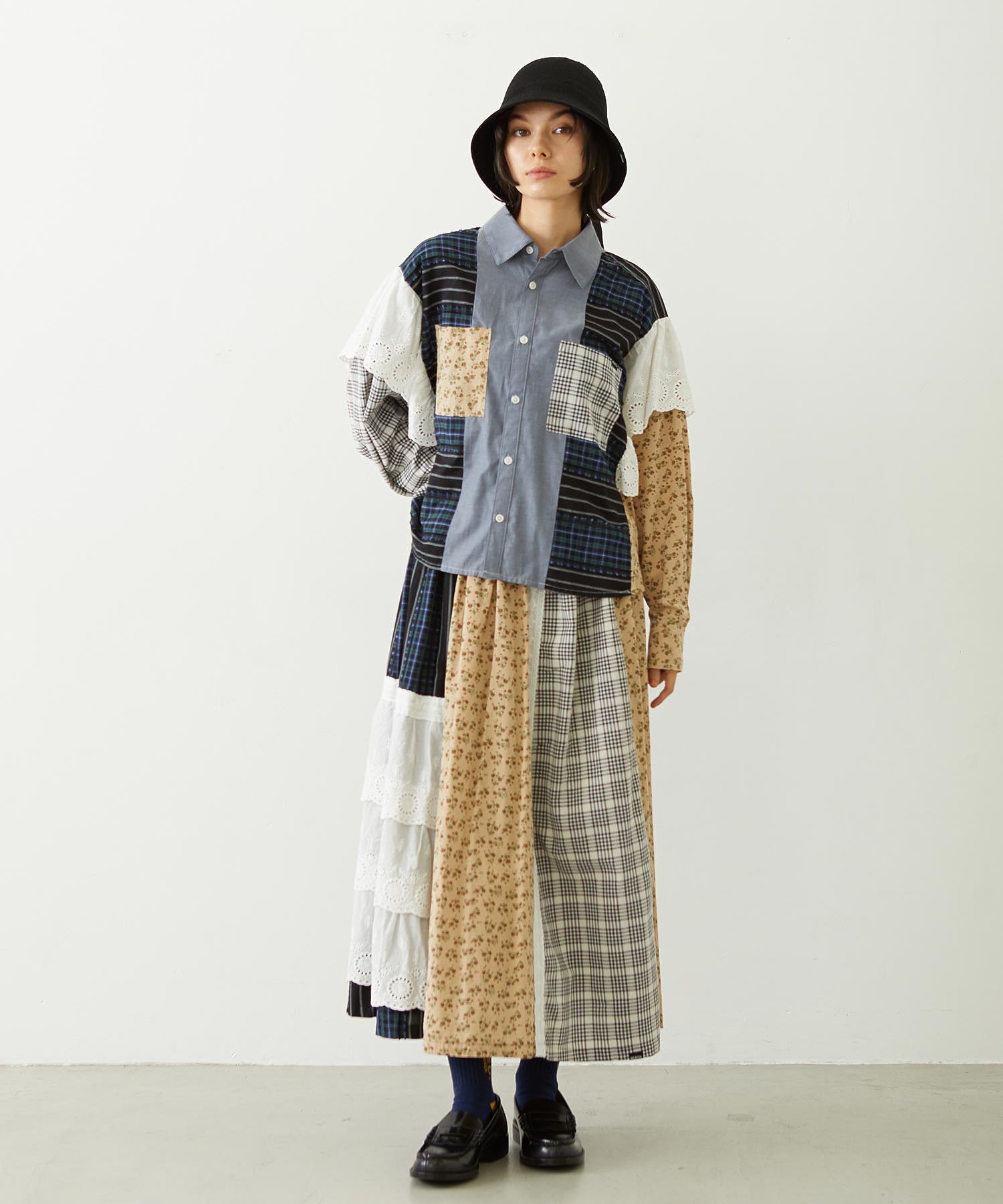 素材 無地部分:ポリエステル56% 綿44% チェックA:綿100% チェックB:綿63% ポリエステル37% 花柄部分:綿77% レーヨン19% 麻4% レース部分:綿100%