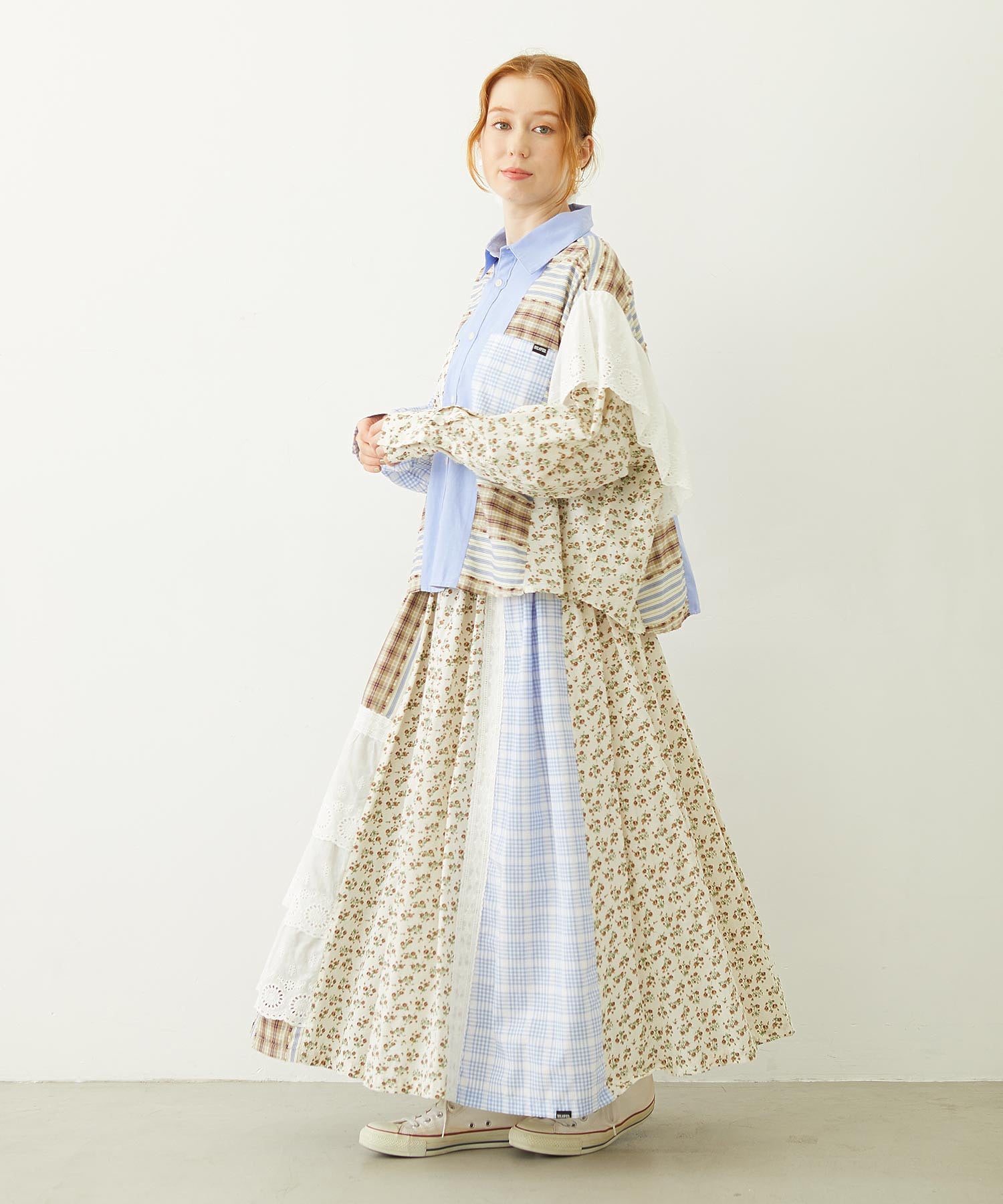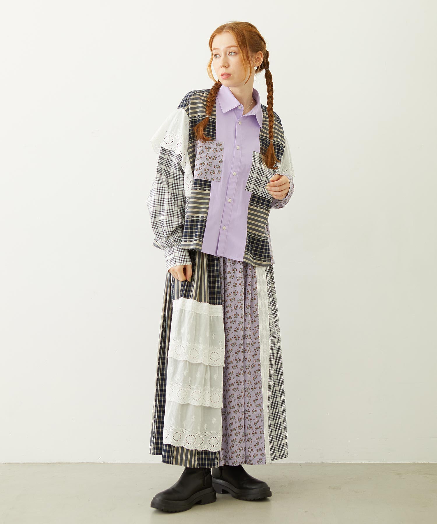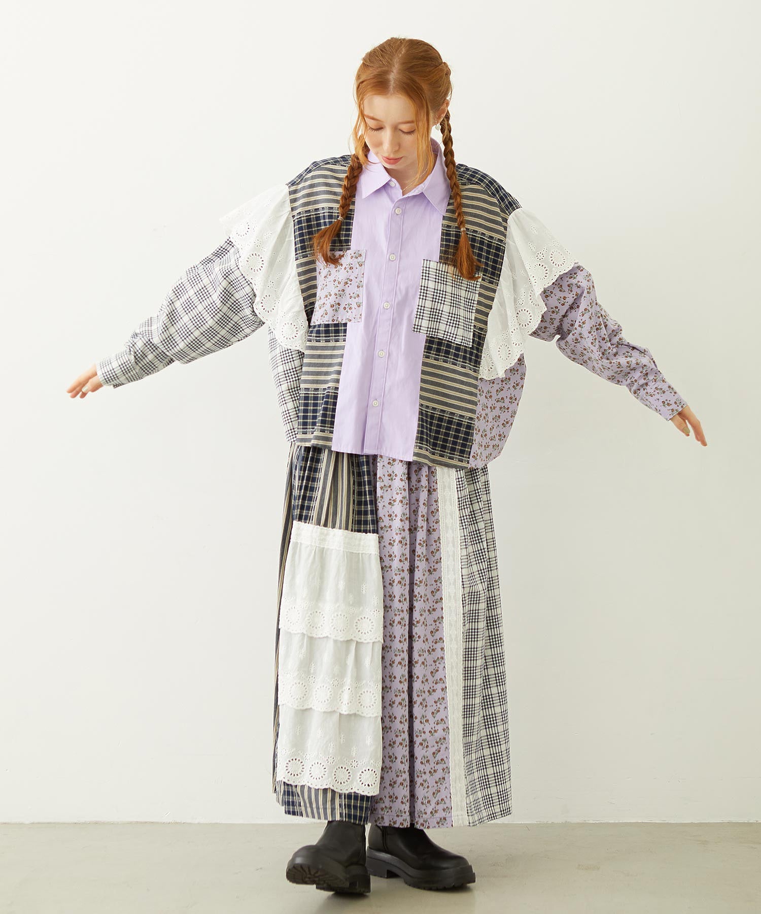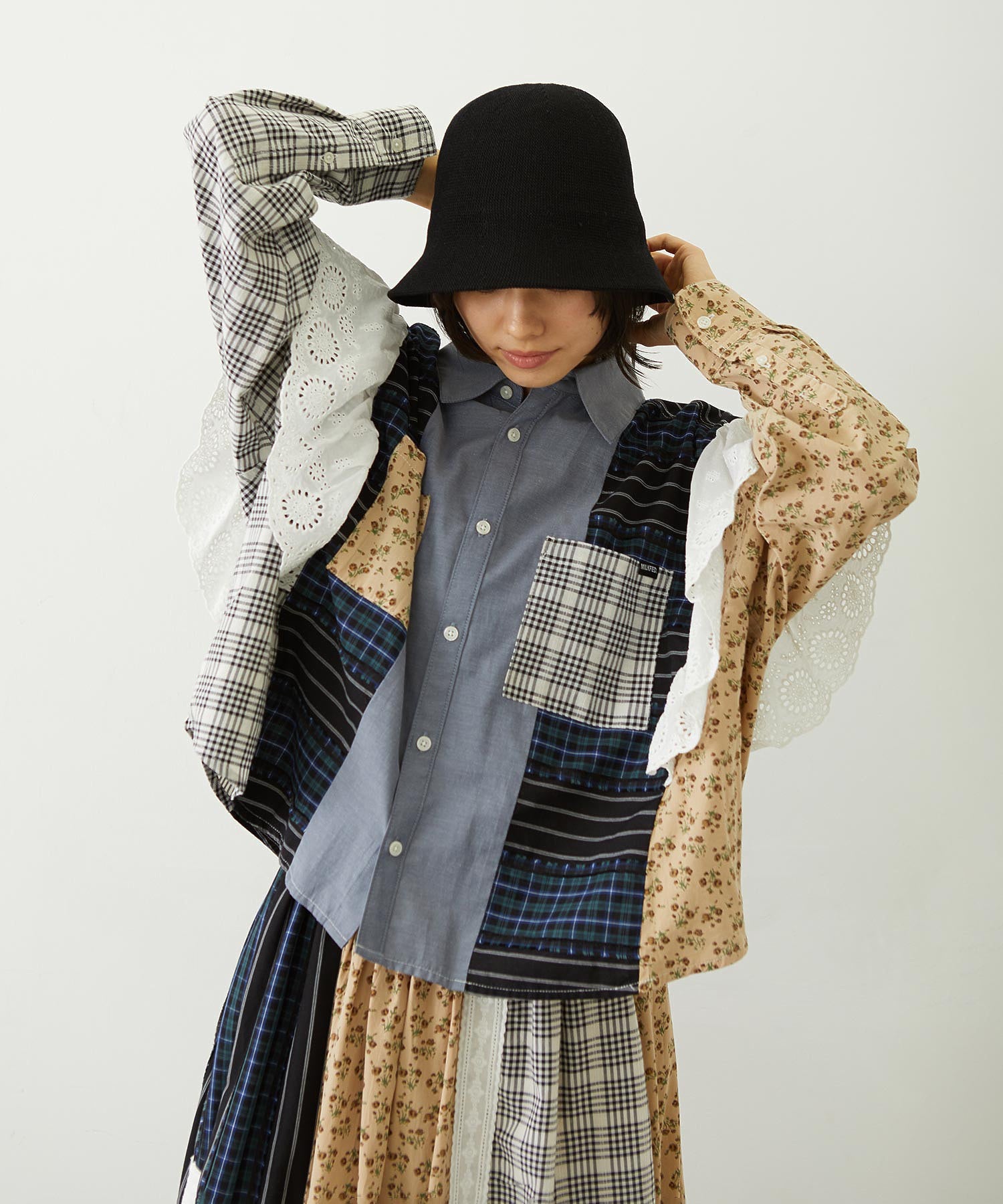素材 無地部分:ポリエステル56% 綿44% チェックA:綿100% チェックB:綿63% ポリエステル37% 花柄部分:綿77% レーヨン19% 麻4% レース部分:綿100%
