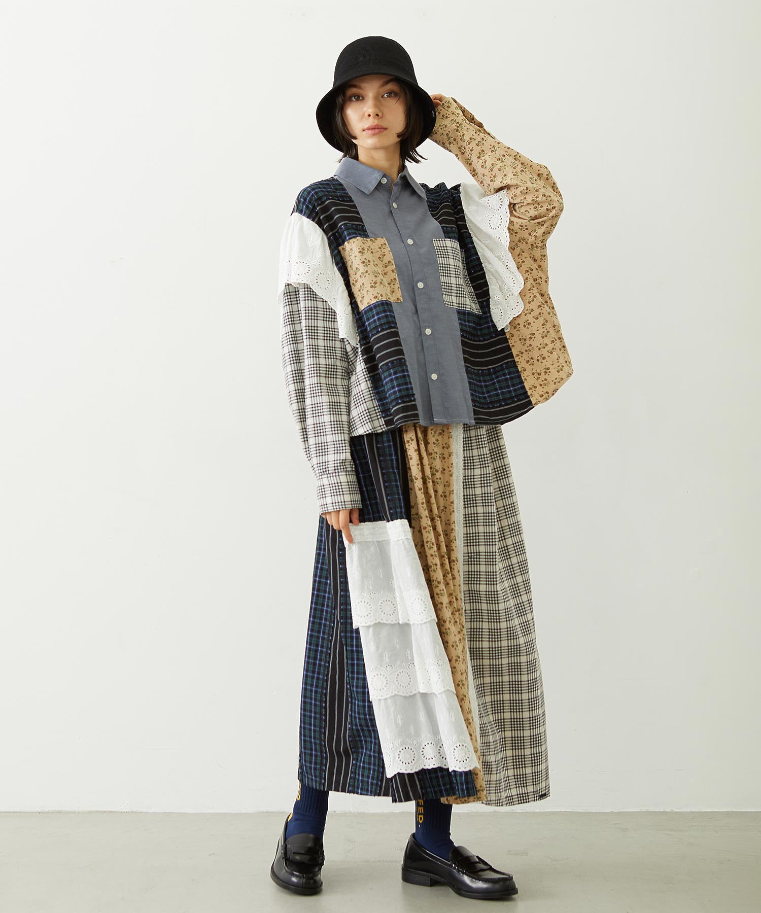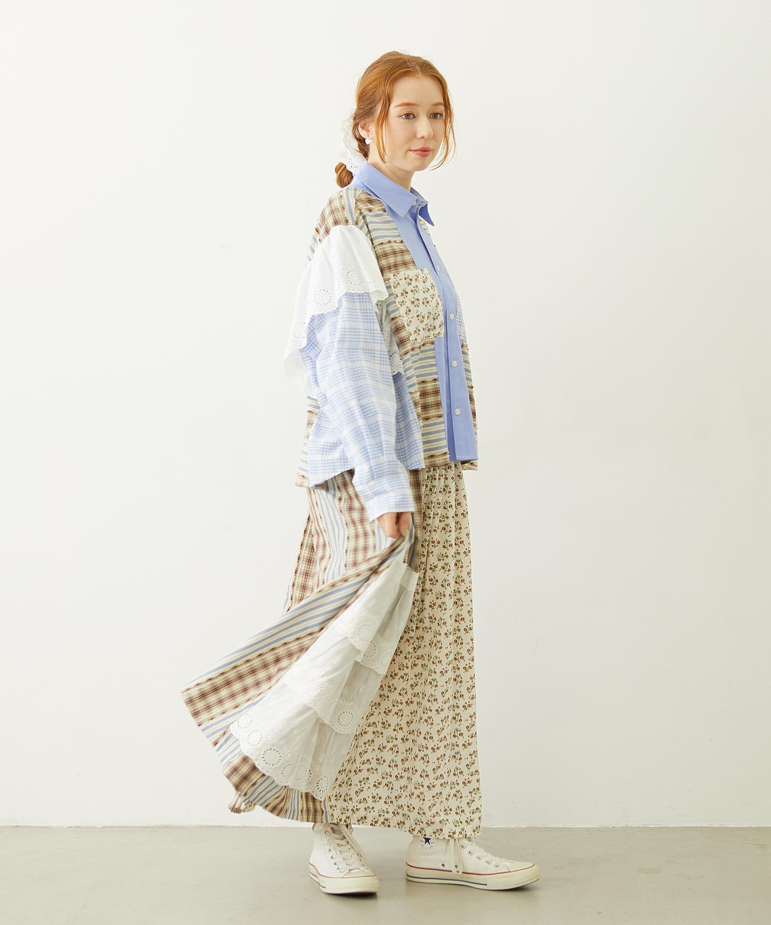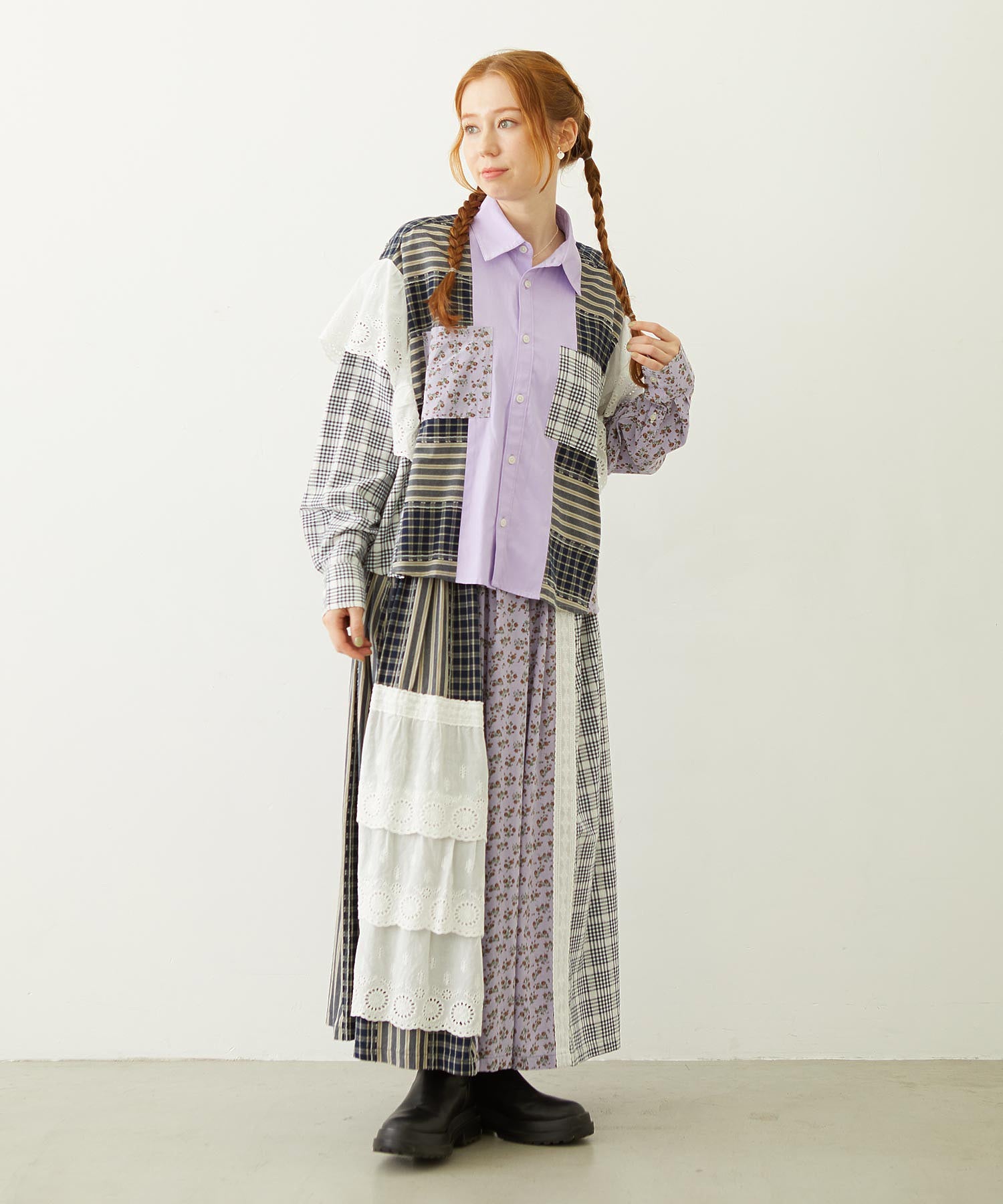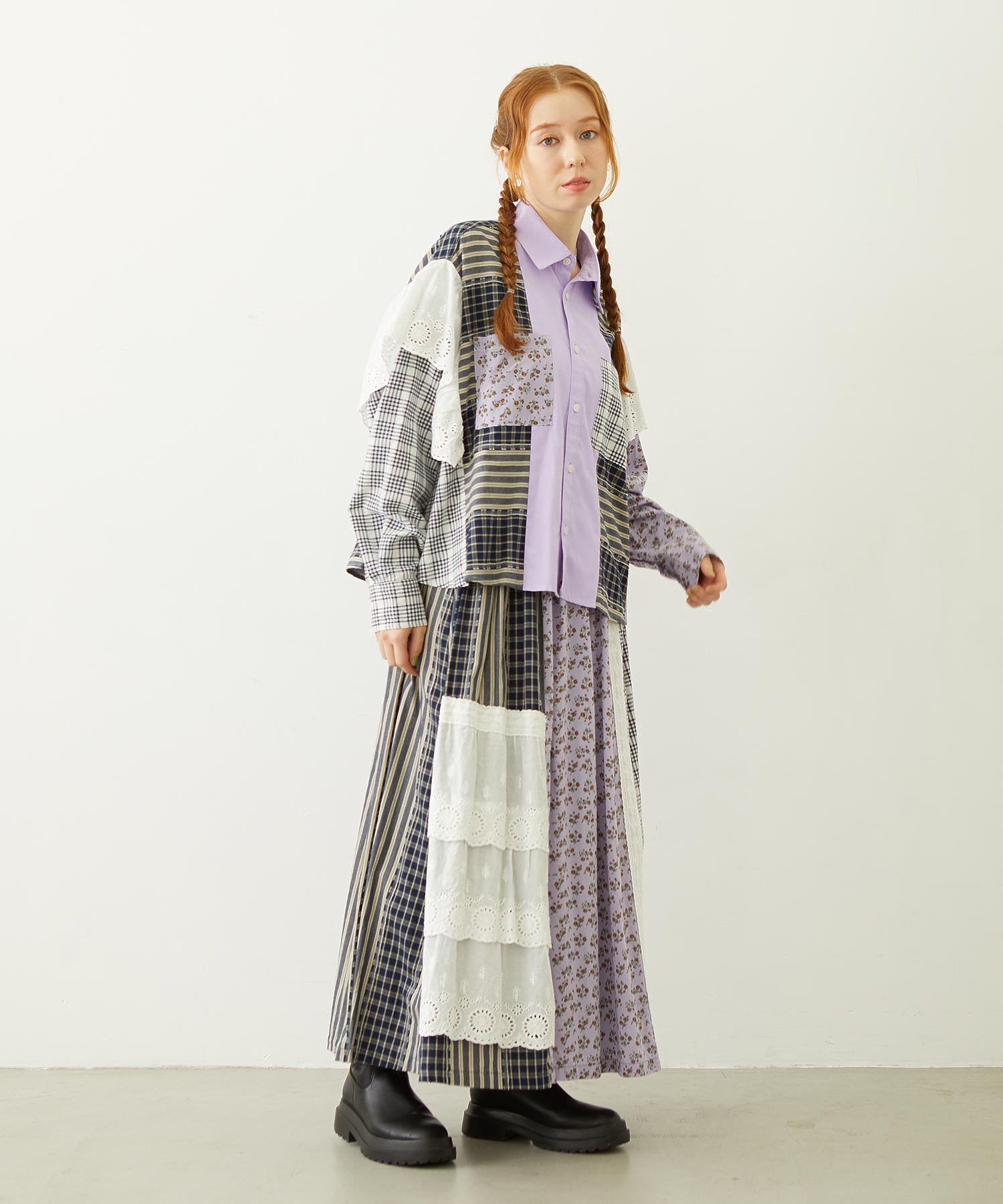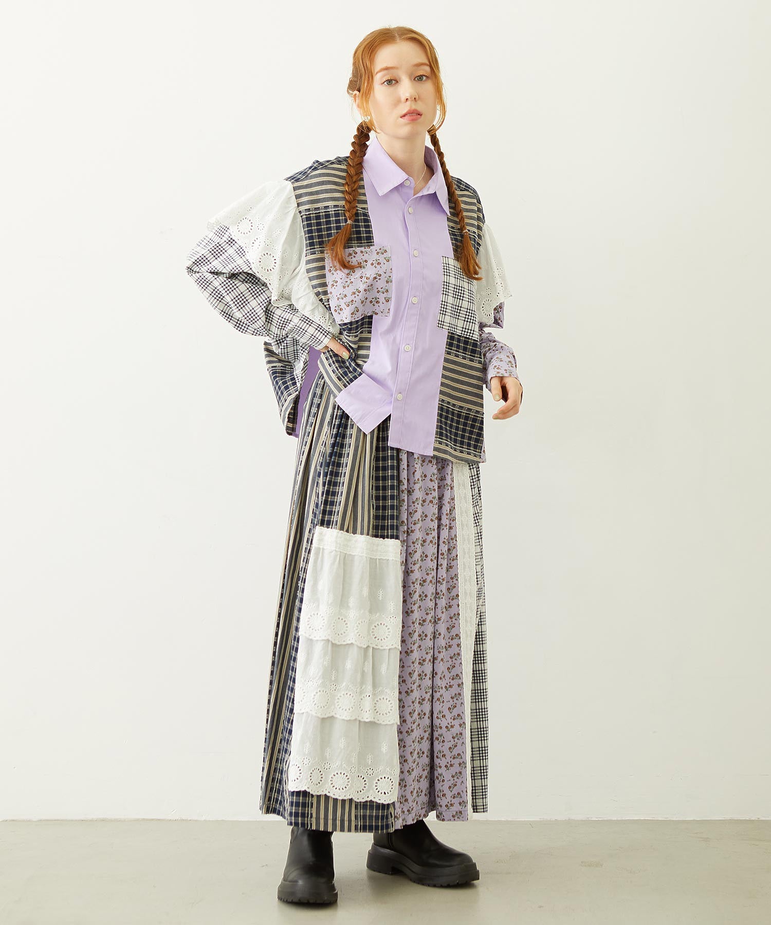 素材 無地部分:ポリエステル56% 綿44% チェックA:綿100% チェックB:綿63% ポリエステル37% 花柄部分:綿77% レーヨン19% 麻4% レース部分:綿100%