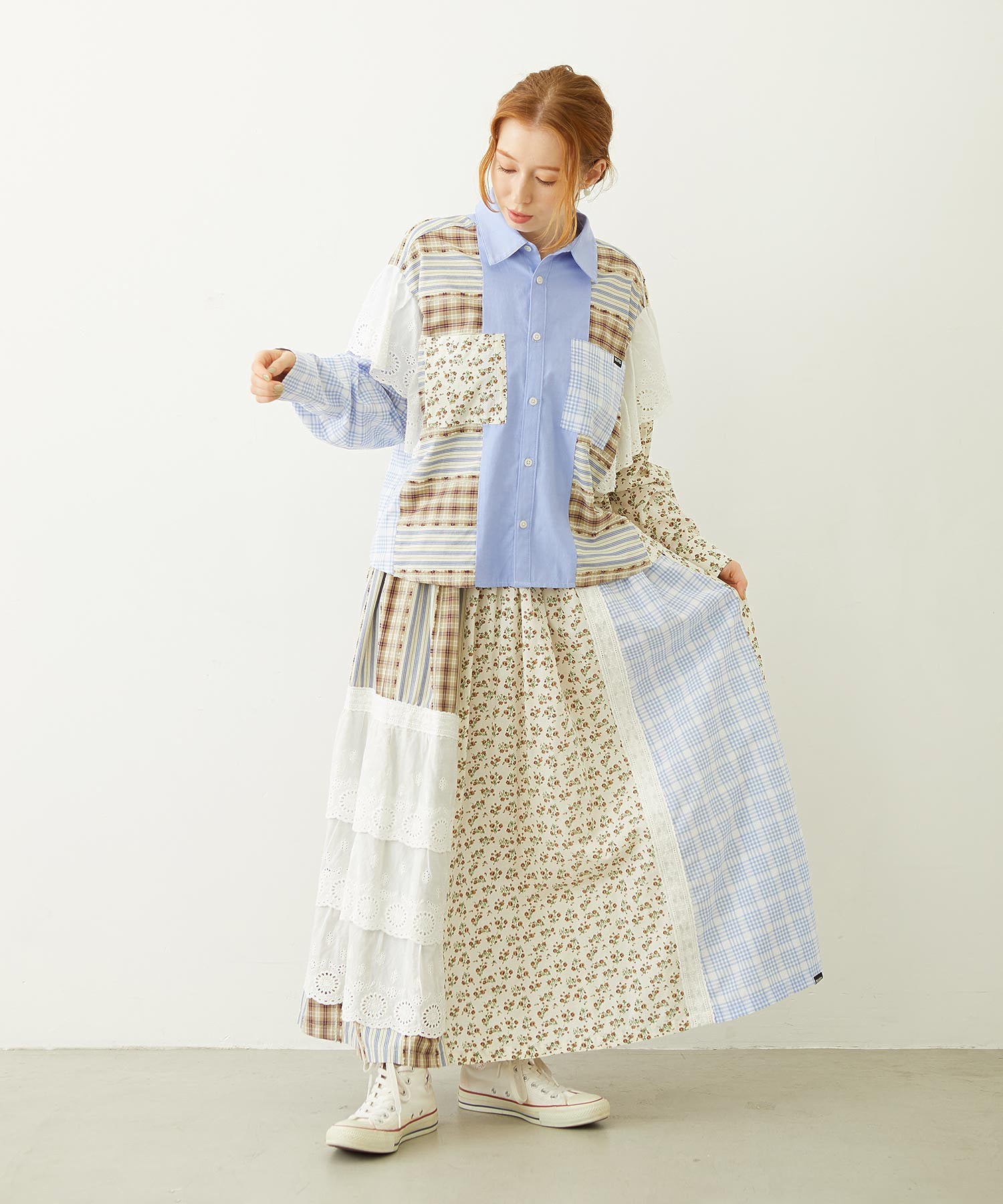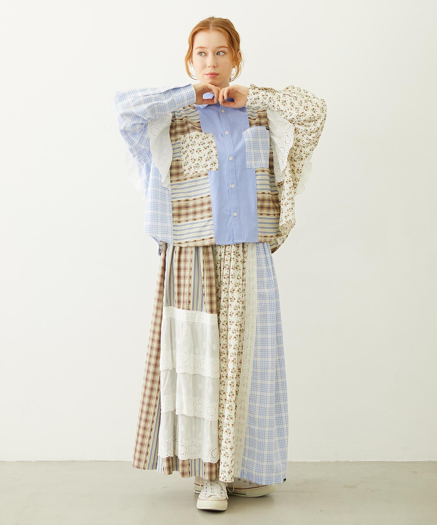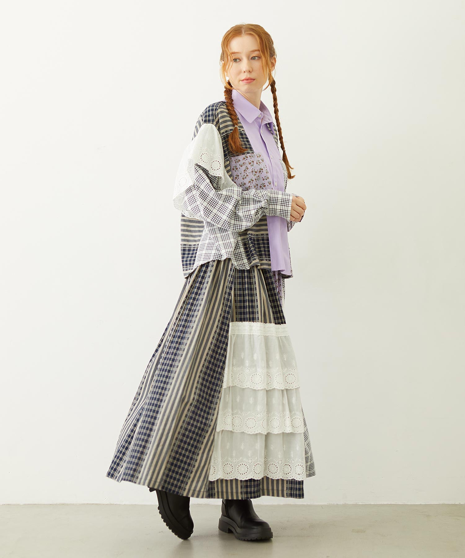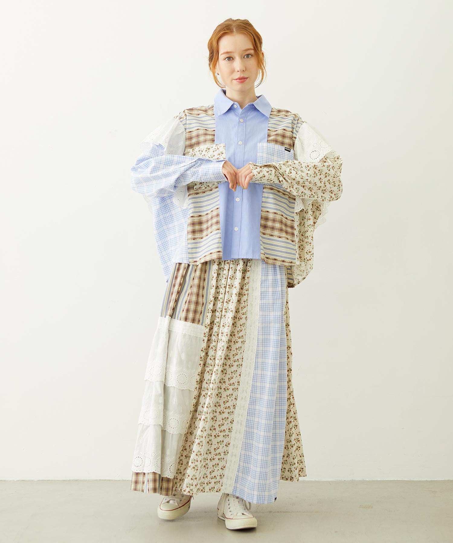 素材 無地部分:ポリエステル56% 綿44% チェックA:綿100% チェックB:綿63% ポリエステル37% 花柄部分:綿77% レーヨン19% 麻4% レース部分:綿100%