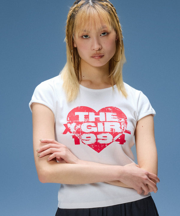 フロントに配置したハートロゴグラフィックが印象的な、コンパクトな半袖Tシャツ。