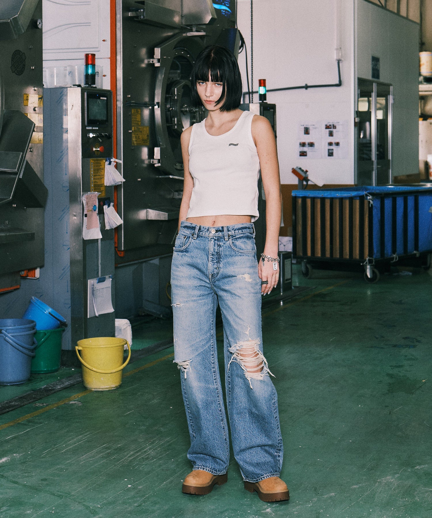 前見頃には大胆なクラッシュ加工を施し、ジーンズの個性が際立つアイテム。
