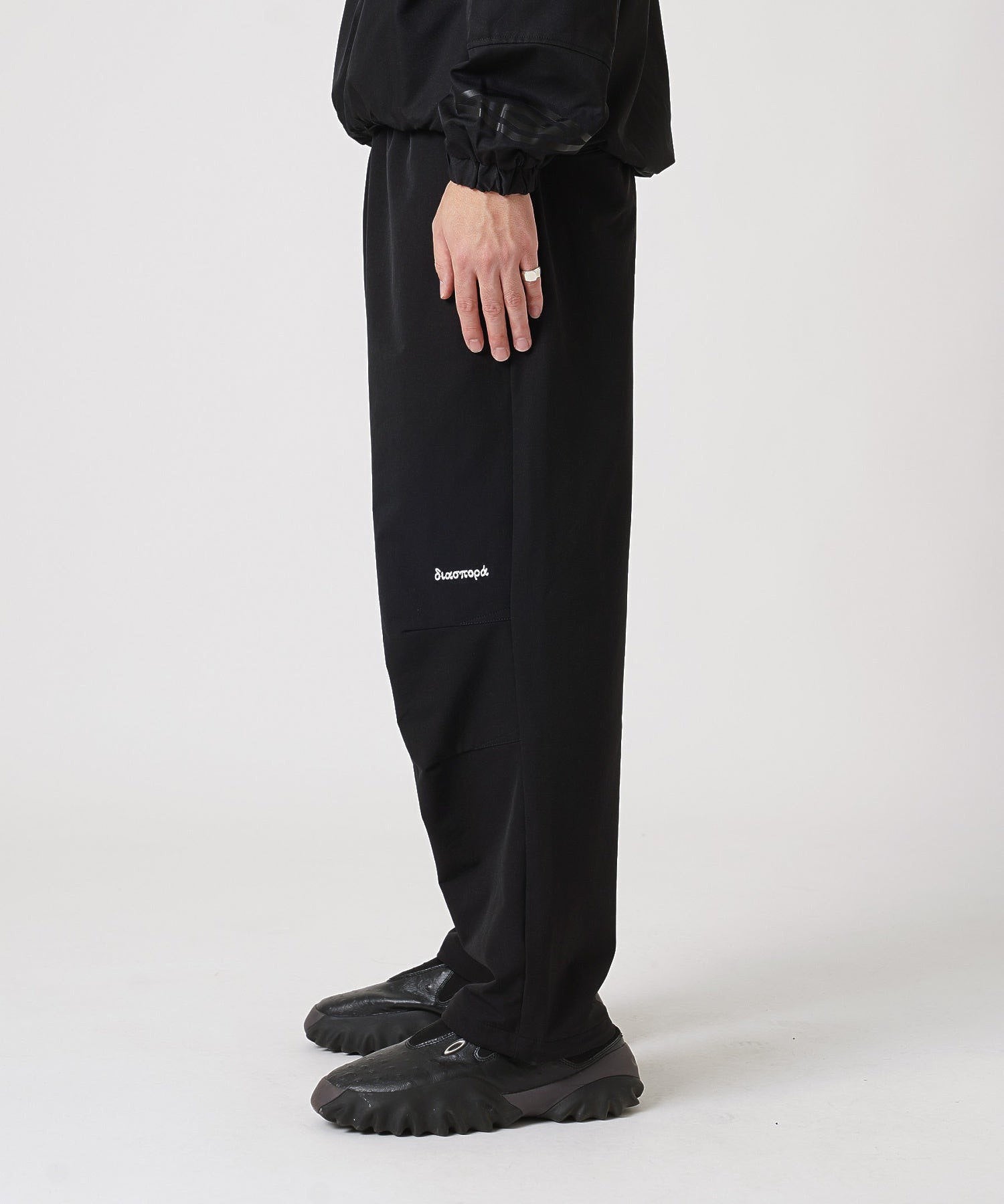 【デザイン】トラックパンツとスラックスのディテールを混ぜ合わせたハイブリッドなイージートラウザー。裾のゴムアジャスターでシルエットを調整可能。優れた伸縮性で快適な着心地の4WAYストレッチ素材を採用。中肉厚でハリコシがあり、ナイロン特有のドライなタッチとマットな表情が特徴。膝にはダーツが入り、動きやすさをサポート。膝上にロゴ刺繍。メーカー品番:PT04・透け感:なし・伸縮性:あり・生地の厚さ:普通・裏地:なし・シルエット:スタンダード【Diaspora Skateboards(ディアスポラスケートボーズ)】2010年に設立された、東京を拠点に活動するスケートレーベル / ビデオプロダクション。 不定期に発表される映像のBGMとして、KID FRESINO / JJJ / 16FLIP / MASS-HOLE / Aru-2等のアーティストの楽曲を選曲。 ファッションシーンでは、GAPやUMBROをはじめとするグローバルブランドから、JazzySportやVainl Archiveといったドメスティックブランドとのコラボレーションでも話題を集める。 2020年1月には、フルレングスビデオSYMBIOSISを発表。【Select By Styles(スタイルス)】