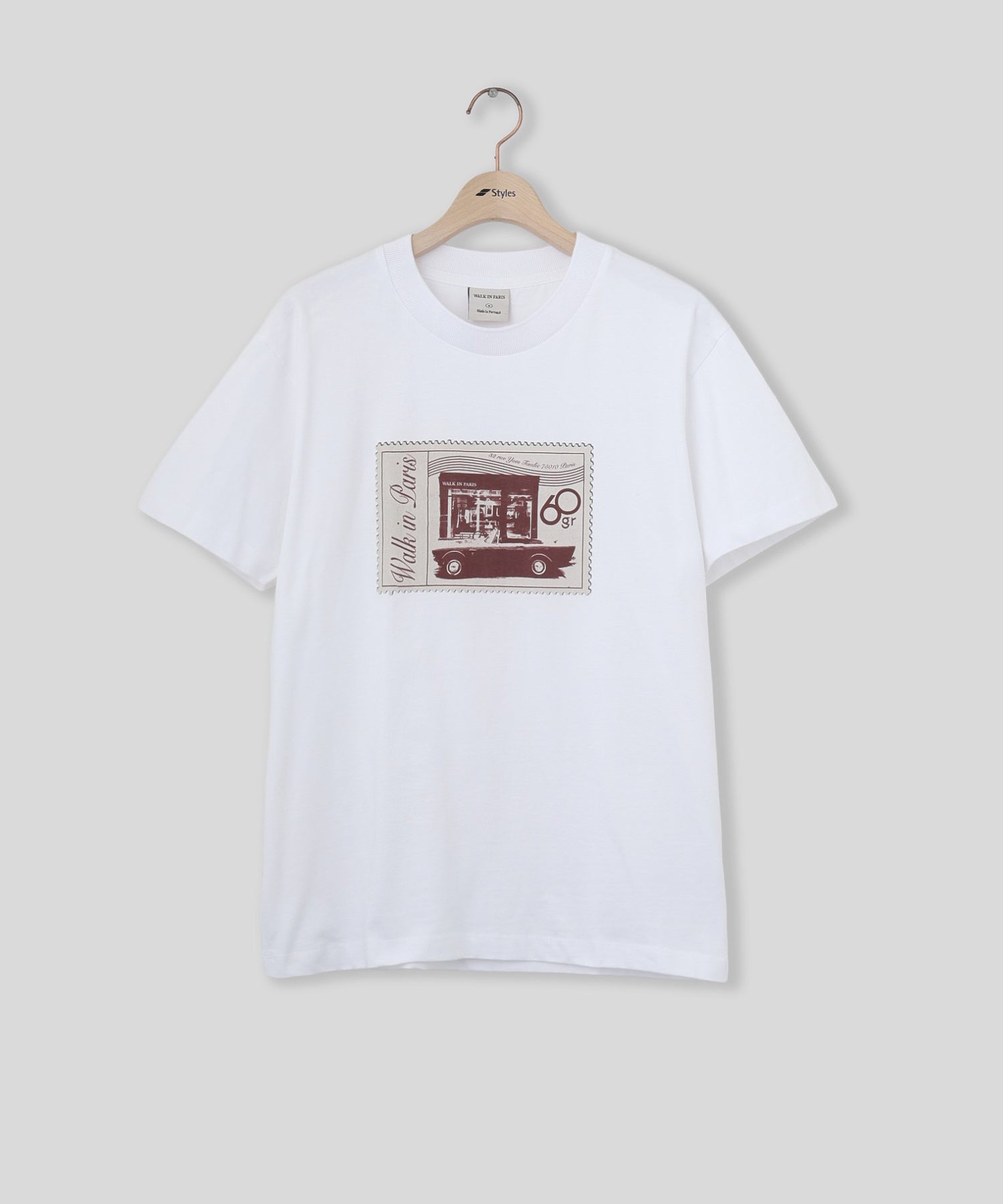 フロントに「Walk in Paris」の切手モチーフのグラフィックをあしらったTシャツ。