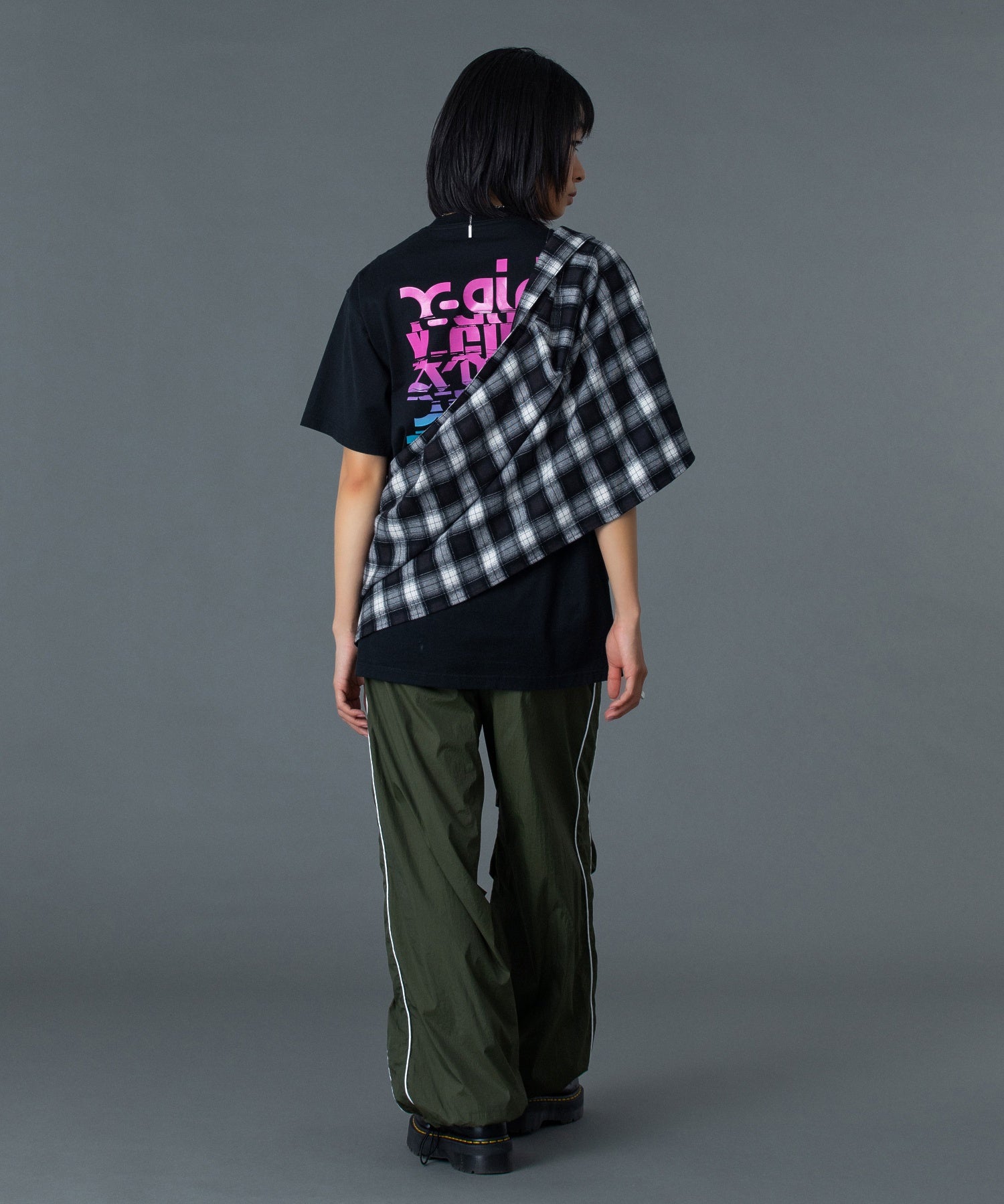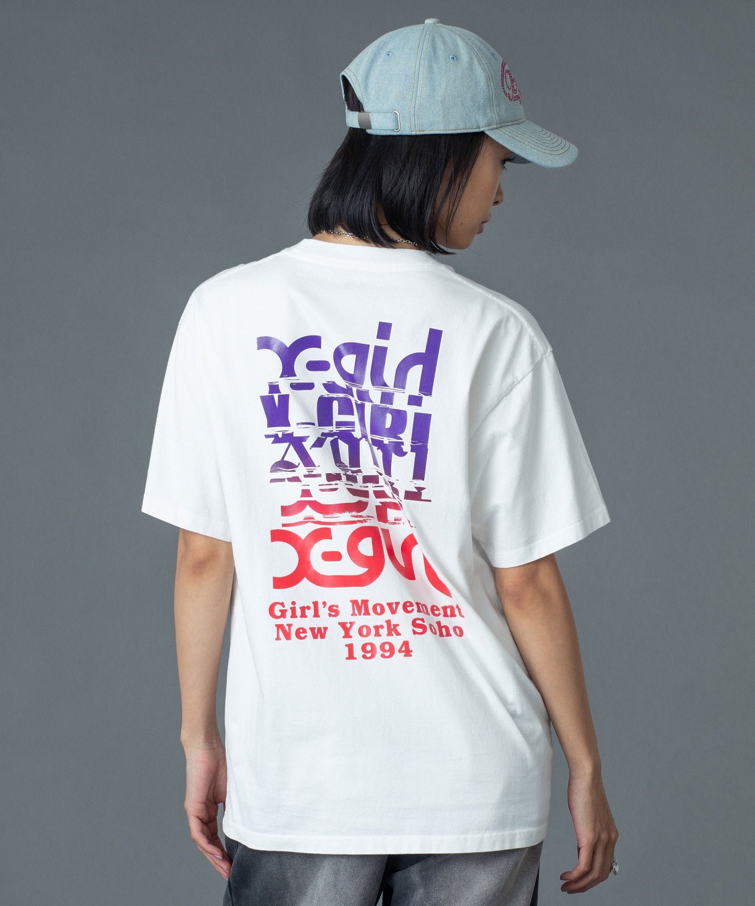 バックスタイルは、フォントをMIXしノイズを加えたロゴグラフィックを大胆に配置し、存在感抜群の仕上がりに。