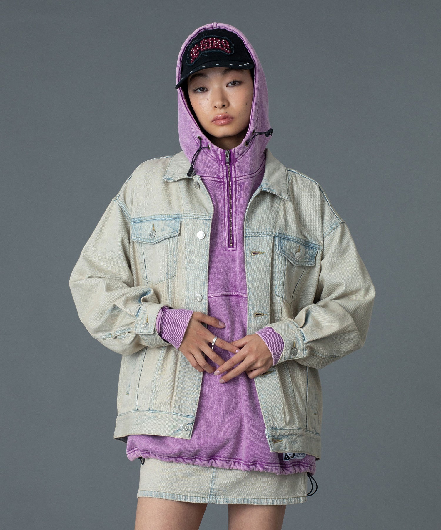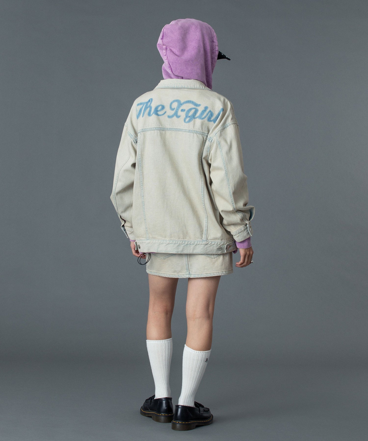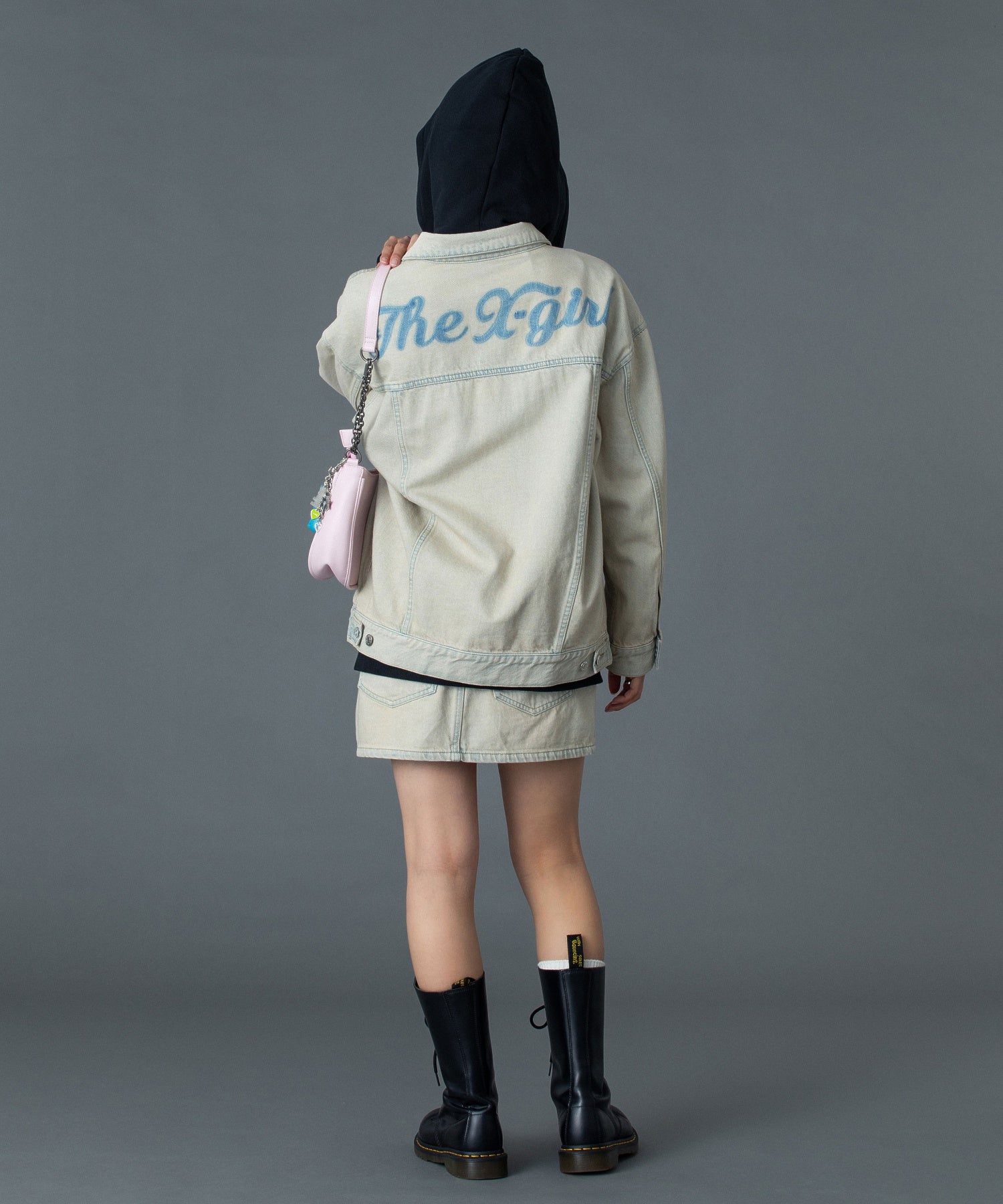 バックスタイルには、ステンシル技法にこだわったX-girlロゴを大胆に配置し、後ろ姿まで印象的に。