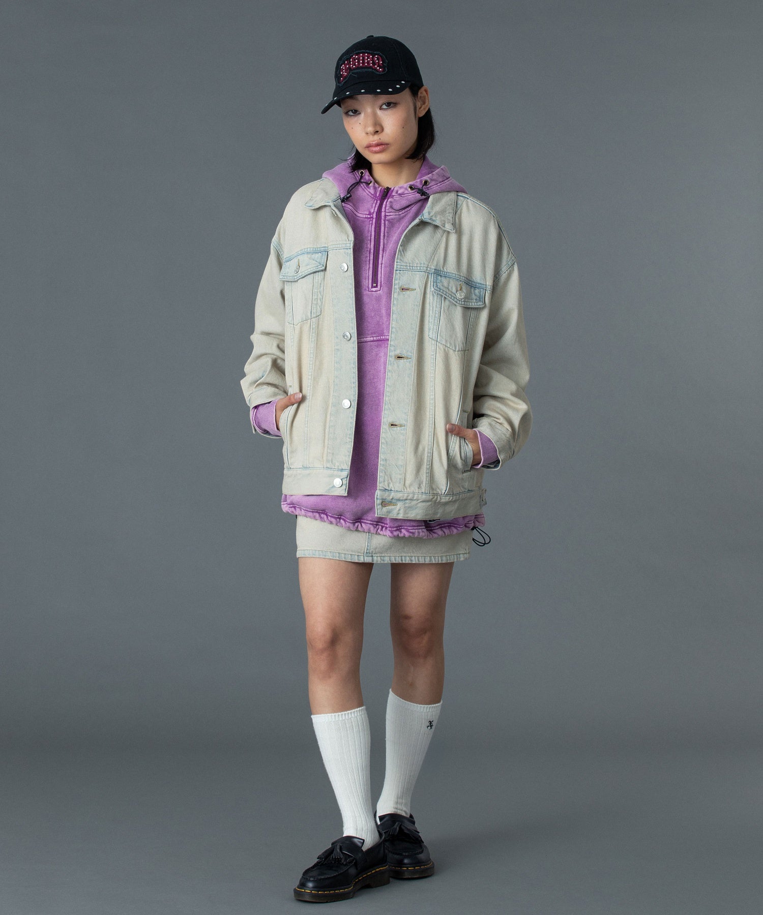 ミニスカートと合わせたガーリーMIXスタイルも好相性。